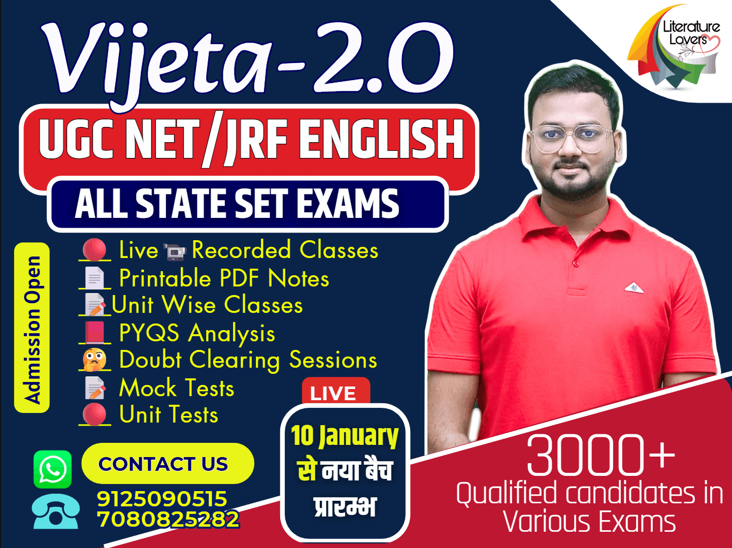 UGC NET JRF & ALL STATE SET ENGLISH LITERATURE ONLINE COURSE BY AKSRAJVEER SIR (LITERATURE LOVERS) π΄ STATUS: LIVE Class will Start From 10th January. π LANGUAGE: Hinglish β° TIMINGS: π Class 1: 4:00 PM β 5:30 PM π Class 2: 6:00 PM β 7:00 PM NOTE- 2 Classes Daily, Monday to Saturday π VALIDITY OPTIONS: 6 Months, 12 Months, and 24 Months π Introducing: UGC NET JRF | SET | VIJETA BATCH 2.O (2026) π π₯ An Exclusive Course by AKSRajveer Sir β Designed for all the Aspirants! π₯ π₯ Why Choose VIJETA BATCH? π΄ Live + Recorded Classes β Never miss a lesson. Learn at your own pace! π PDF Notes β Printable, Unit-wise, and Exam-Focused. π§βπ« Unit-Wise Coverage β Structured approach for strong conceptual clarity. π PYQs + In-Depth Analysis β Master pattern-based preparation. β Doubt Clearing Sessions β Ask anything on every Saturday π Mock Testsβ Real exam feel with every test. π What Sets Us Apart? π¨βπ« Learn from the Best β AKSRajveer Sir β UGC NET/JRF in English (5 Times Qualified) β UPHESC Assistant Professor β Junior Hindi Translator (2 Times) β CTET, TET, SUPER TET, UP PGT Qualified π 10+ Years of Teaching Experience π― 3000+ NET/JRF TGT PGT ASSISTANT PROFESSOR etc Qualifiers Mentored Successfully π Course Highlights: β¨ Printable PDF Notes β¨ Complete Syllabus Coverage β All 10 Units β¨ Live Doubt Sessions on Every SATURDAY β¨ Expert Exam Strategies β Time Management, Paper Solving Techniques β¨ Revision & Marathon Sessions β Before Exam Boost β¨ Flexible Learning β 24/7 Access, Anytime, Anywhere β¨ Custom Playback & Download Option β Study without internet worries β¨ Progress Tracking with Mock Tests + Feedback π― Your Success Journey Starts Here! β UGC NET | JRF | All-State SET Exams β Dedicated for 2026 Attempt β Ideal for NET JRF All STATE SET EXAMS, Assistant Professor Aspirants and for Literature Enthusiasts. π LIMITED TIME OFFER ENROLL NOW & Unlock Exclusive Discounts! π Website: www.literaturelovers.in π Contact Us: π² 7080825282 | 9125090515 π₯ Ignite Your Passion. Conquer Your Dream. Become a VIJETA! π₯ Join the Batch, Join the Movement β UGC NET ENGLISH 2026 Success Awaits You! π¨ Important Note β οΈ Course Fee is NON-REFUNDABLE. Please read all details carefully before purchasing.